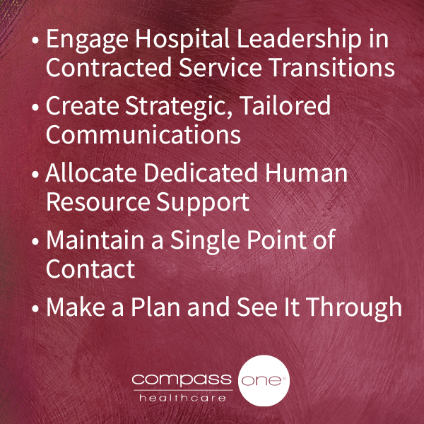 When Compass One transitions hospitals to our services, we bring in a team dedicated to communication; this collaboration between our communications team and our new client's communication team helps to keep messaging clear, tight, and in line with the culture of each transitioning facility.